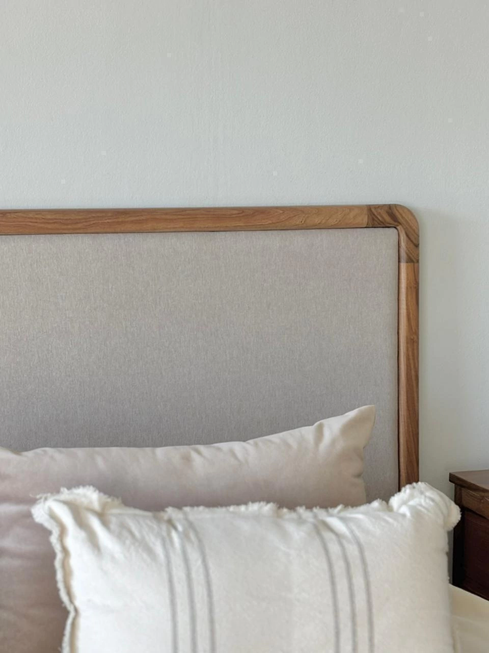 Respaldo con marco en madera maciza de petiribi y tapizado en tela de alta calidad. Combina la calidez de la madera con la comodidad del tapizado, ideal para darle estilo y confort a tu dormitorio.