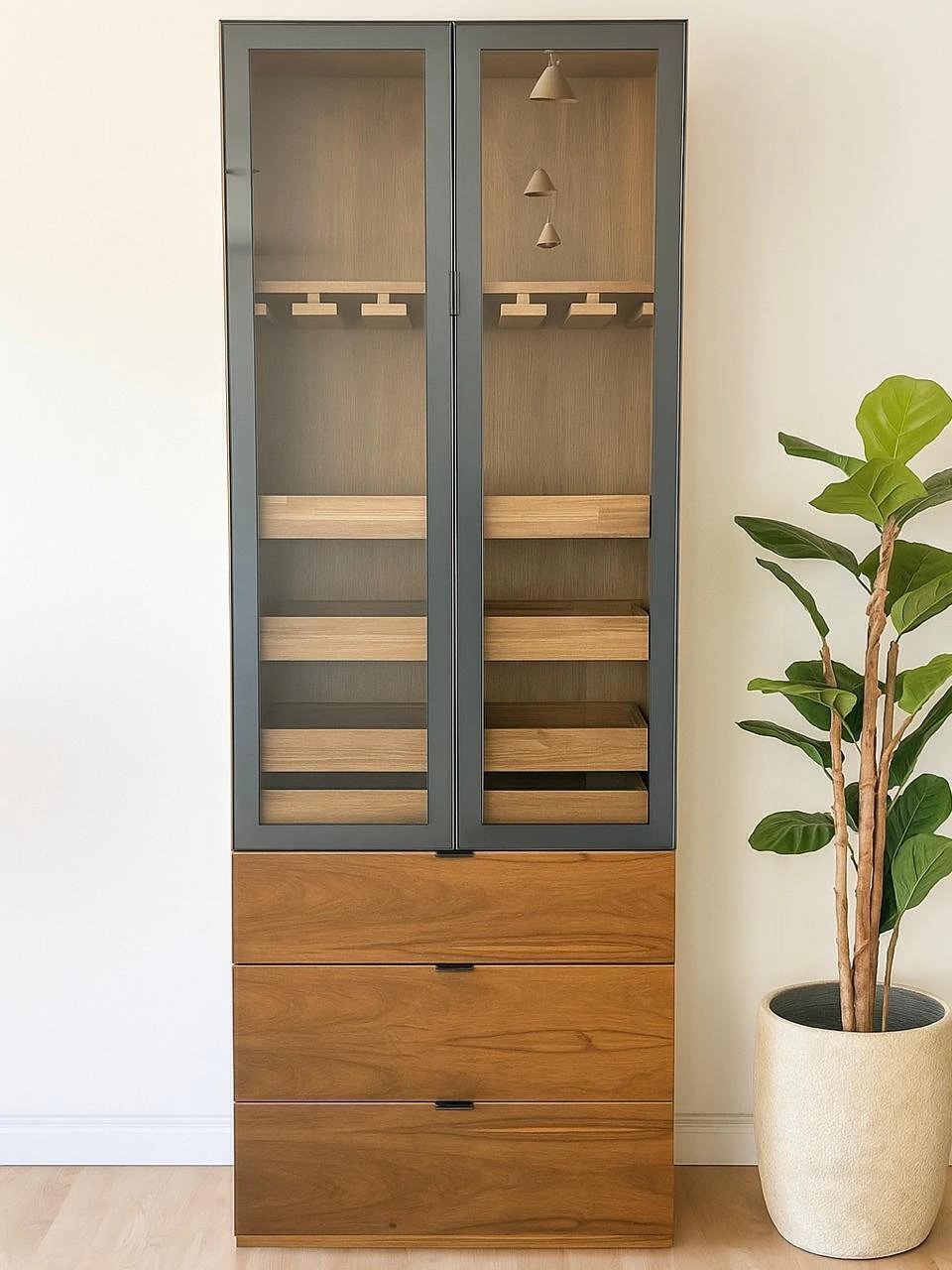Un diseño que combina calidez y modernidad. Su estructura en petiribi realza la nobleza de la madera, mientras que las puertas de aluminio negro le aportan un estilo contemporáneo.