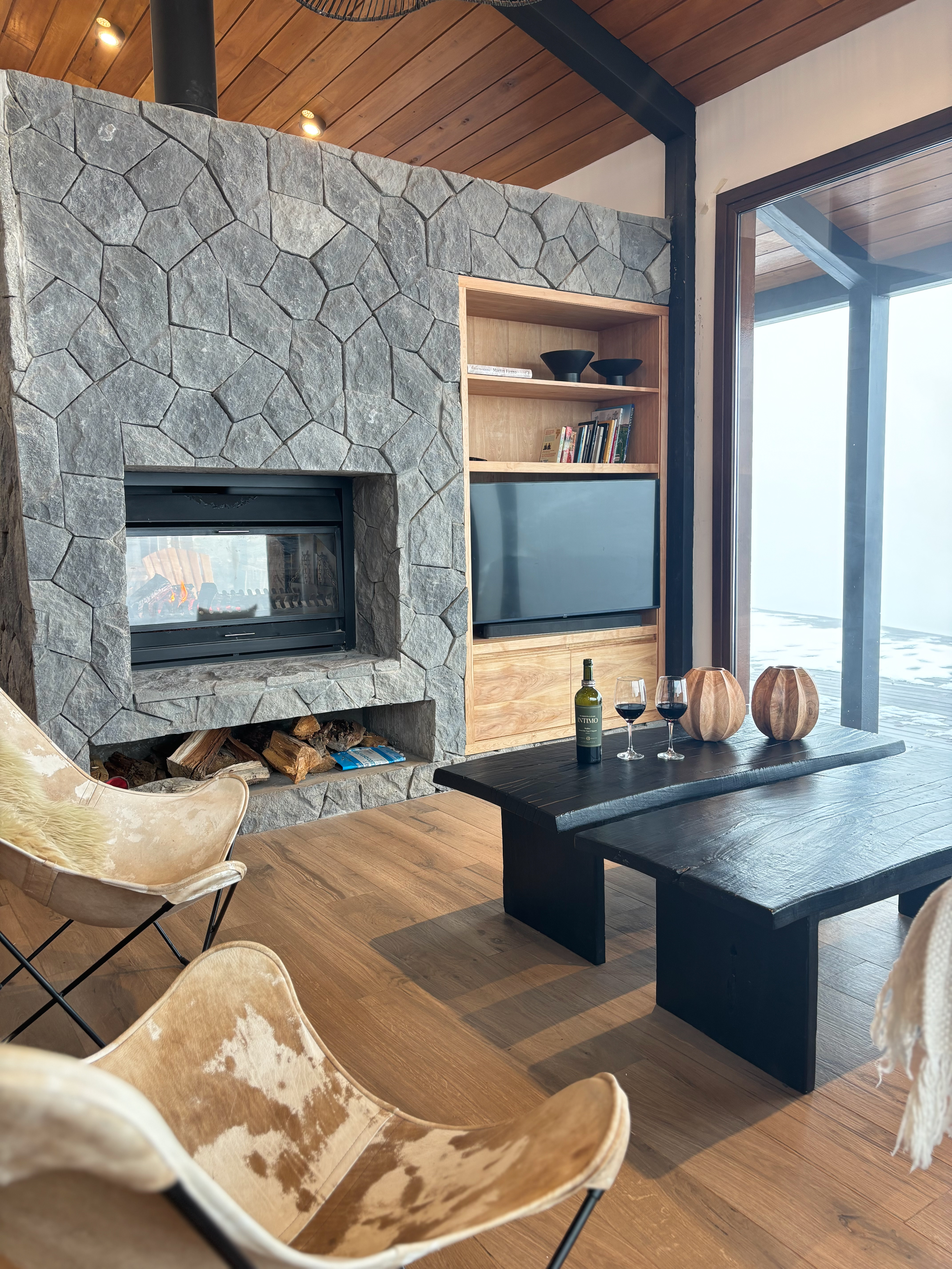 Las mesas ratonas Lonjas en el living funcionan como punto de encuentro. Los sillones de cuero suman textura y cómodidad, invitando a relajarse frente al hogar. Cada elemento fue pensado para acompañar momentos de pausa: una charla, una copa de vino, el fuego encendido y el tiempo sin apuro.