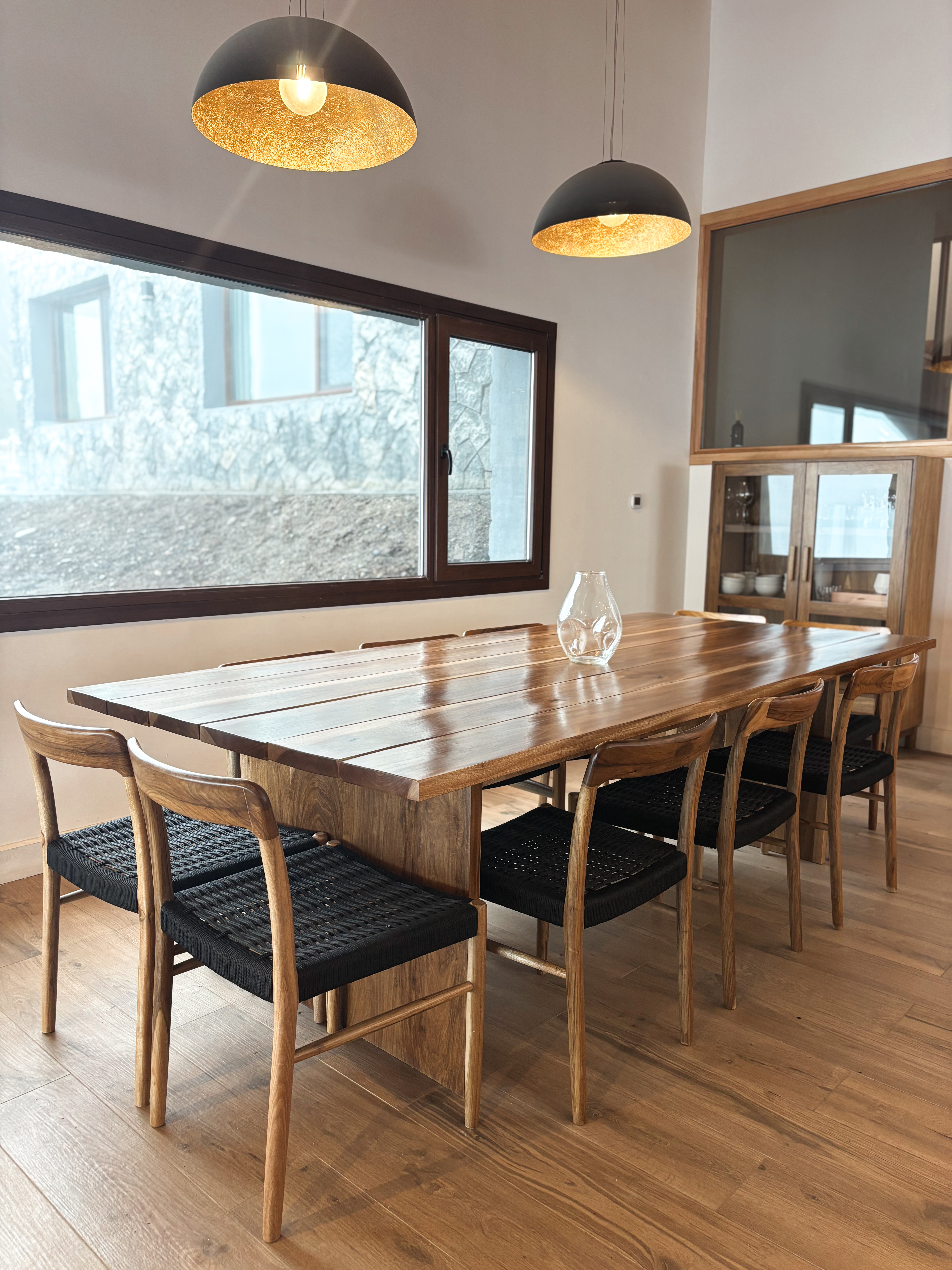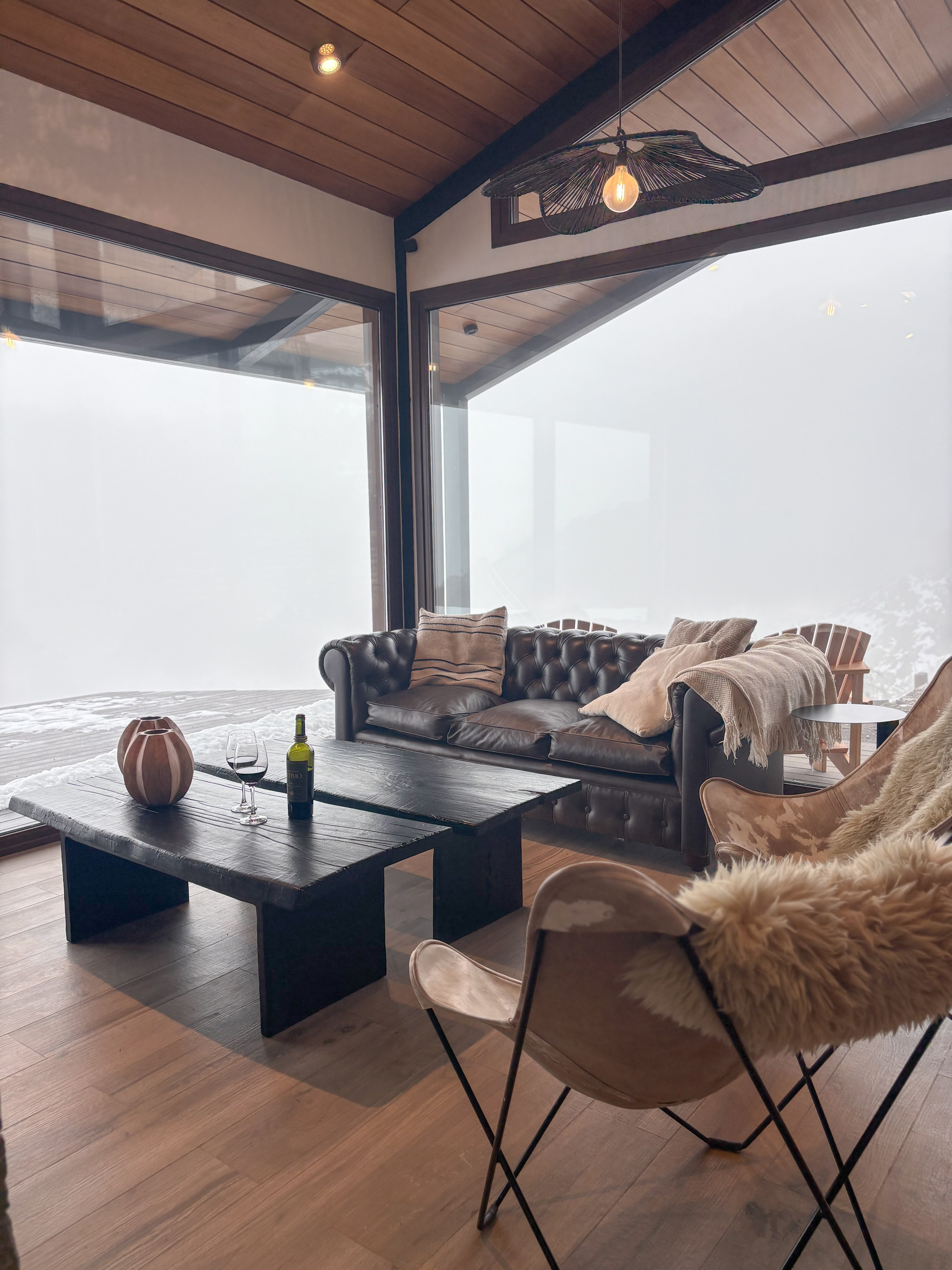 La selección de muebles se realizó en sintonía con el entorno. Se eligieron materiales nobles como madera y cuero, que dialogan naturalmente con la piedra y la arquitectura de la casa. Las piezas aportan presencia y carácter sin competir con el paisaje.